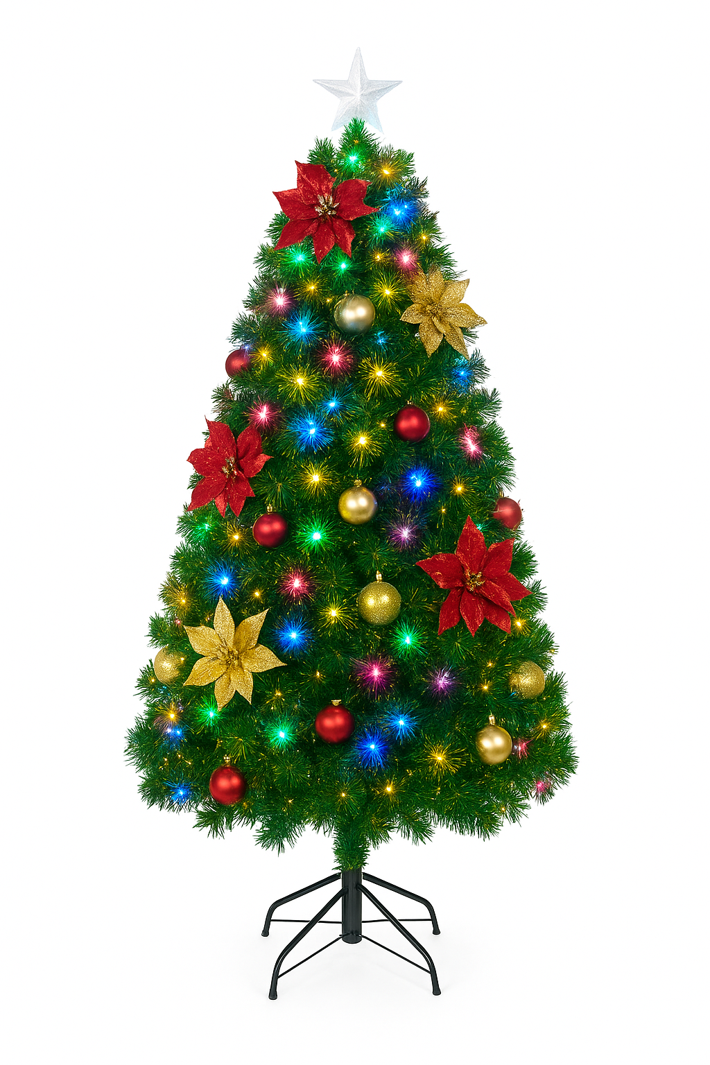 A 150CM fresh-green Christmas tree decorated with multi-colour LED lights, red & gold poinsettia flowers and assorted baubles. Features dense realistic branches, bright full-coverage lighting and a sturdy metal stand. Easy to assemble and perfect for home or commercial festive décor.